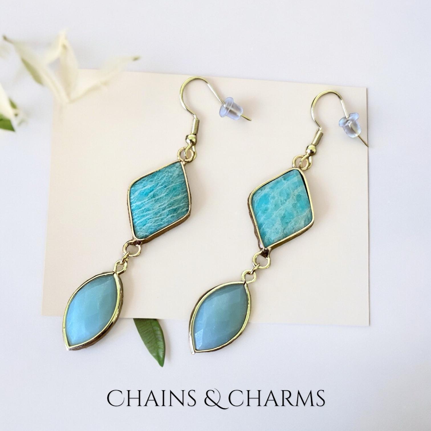 Deze oorbellen zijn samengesteld uit bedels met Amazoniet. Amazoniet wordt ook wel de edelsteen van harmonie genoemd. Het stimuleert harmonie in jezelf en met anderen. Het is een edelsteen die de waarheid spreken stimuleert en helpt vrede te stichten. De steen helpt je helder en duidelijk je gedachten en gevoelens over te brengen.